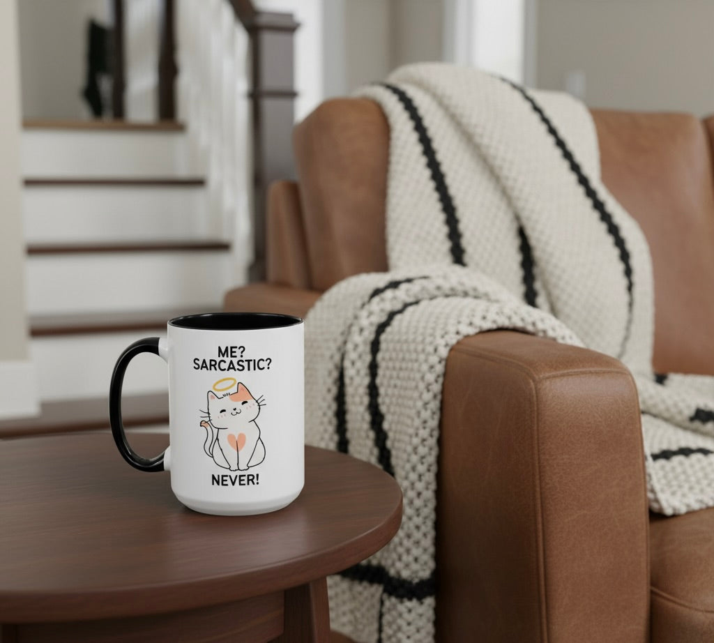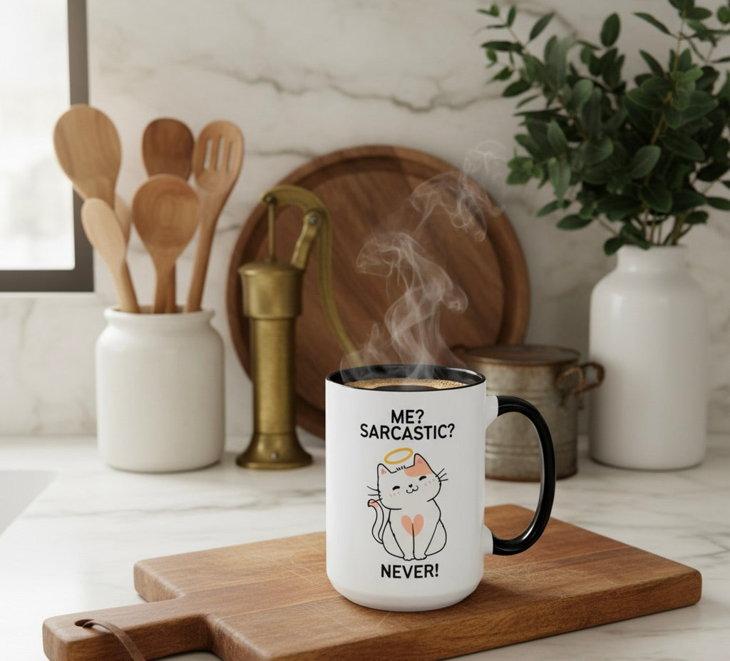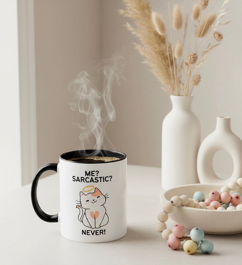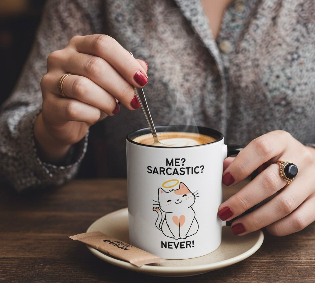 Meet your new favorite mug — featuring a “totally innocent” cat rocking a halo, because clearly sarcasm has never crossed their mind (or yours, right?). Perfect for sipping your coffee while pretending you’re the saint of patience… even though everyone knows better. Whether you’re serving side-eye, sass, or just caffeine-fueled truths, this mug delivers it all with angelic charm.