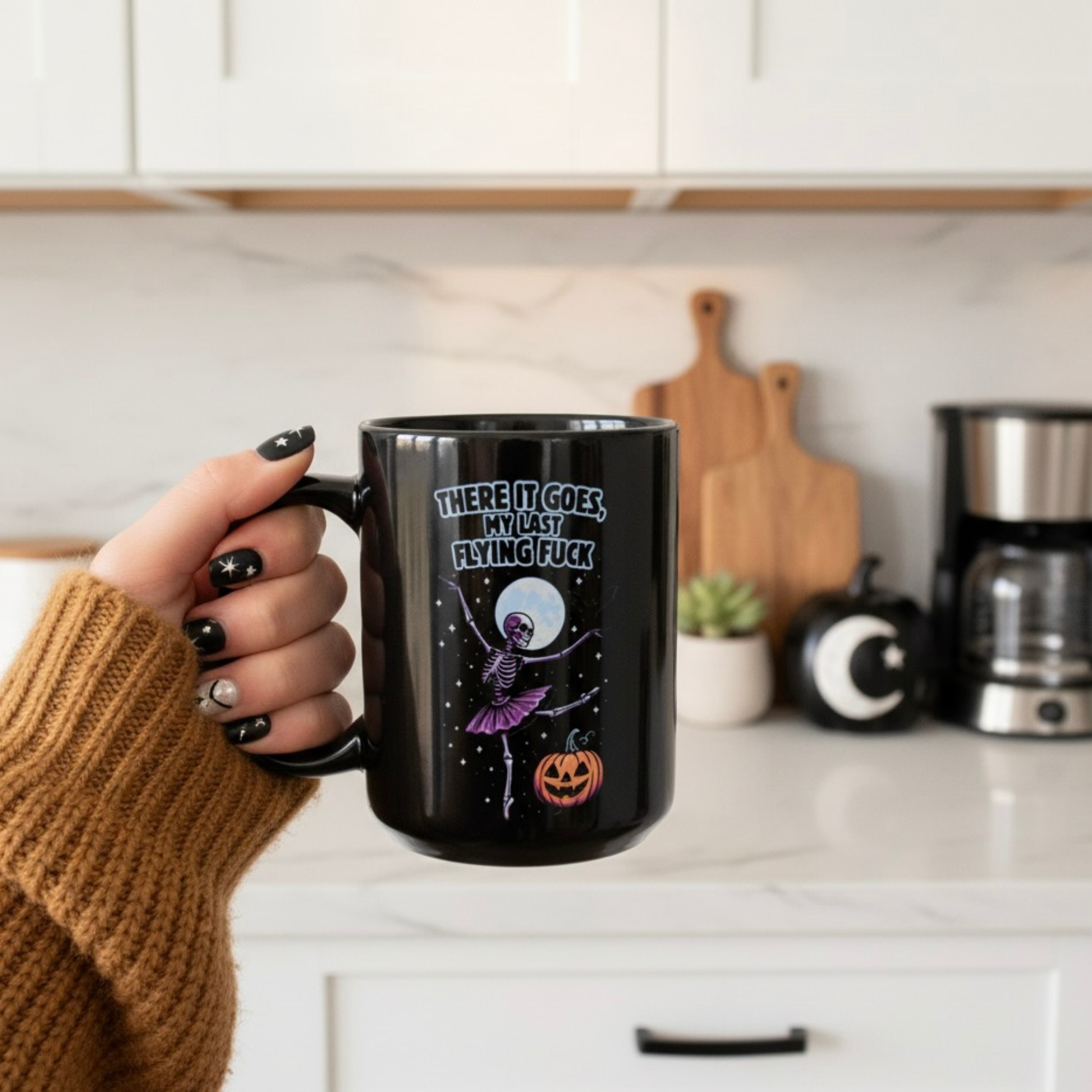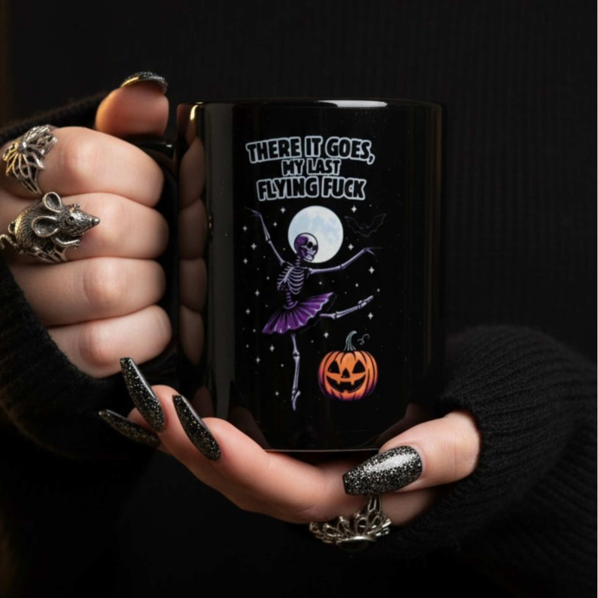 Say goodbye to giving a damn— literally. The "There It Goes, My Last Flying Fuck" mug features a skeleton ballerina twirling gracefully under a full moon, waving farewell to your patience, energy, and tolerance. With a neon style and a dash of sarcastic dark humor, this mug is equal parts spooky and sassy. Whether you're sipping pumpkin spice, black coffee, or pure spite, this mug is the perfect daily reminder that you have exactly zero fucks left to give.