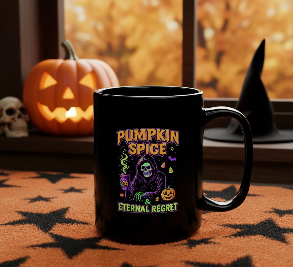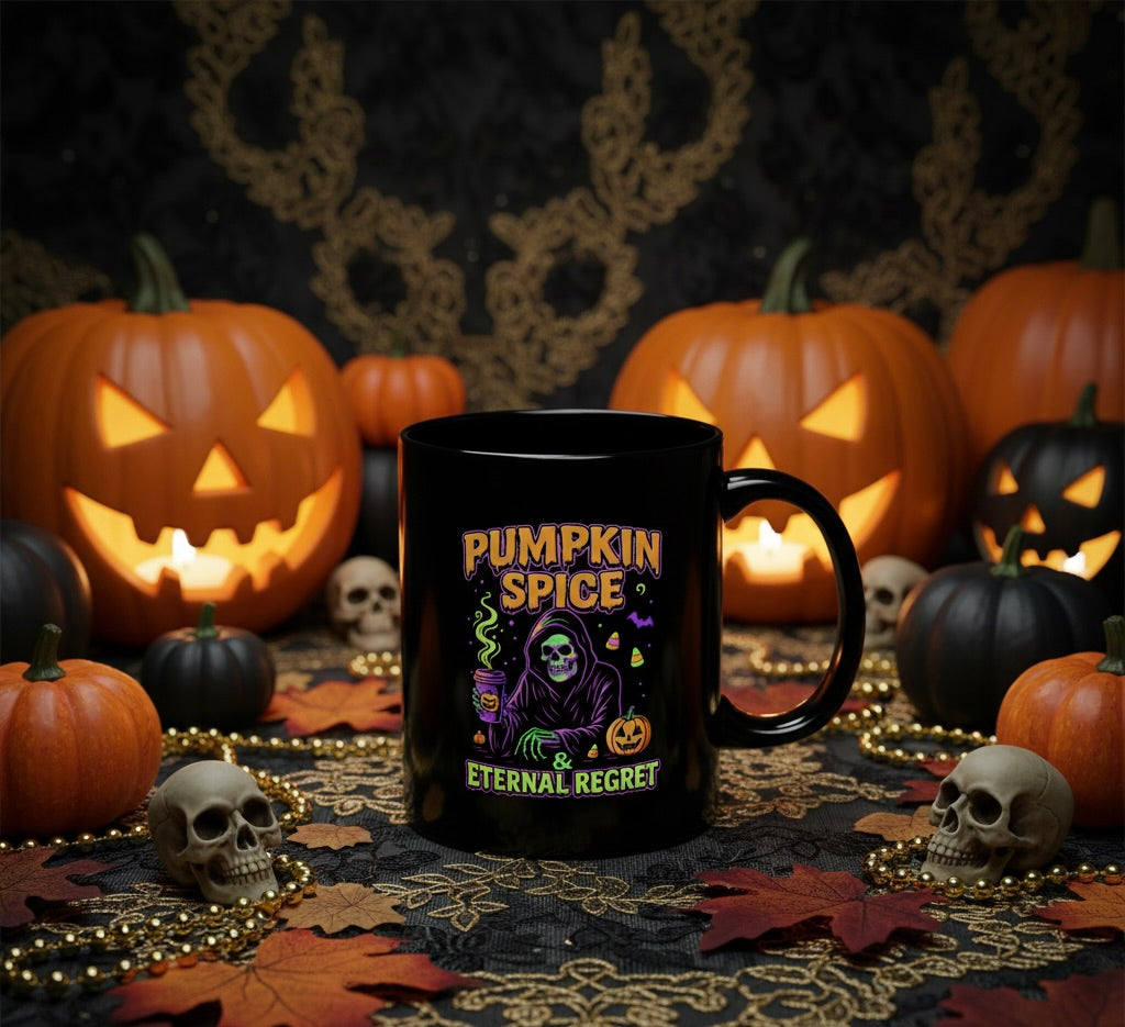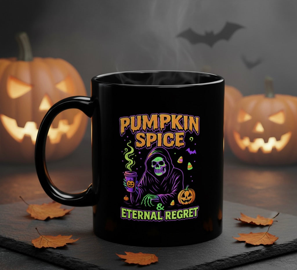 Meet "Pumpkin Spice & Eternal Regret"— the mug that captures the true spirit of fall: caffeine, sarcasm, and just a dash of existential dread. Featuring a neon-styled Grim Reaper casually sipping on a pumpkin spice latte, this design has bold oranges, greens, and purples against a black backdrop. Candy corn, jack-o'-lanterns, and swirling steam complete the vibe, making it the ultimate spooky-season companion. Perfect for sipping your pumpkin spice brew, black coffee, or whatever potion keeps you functioning— this mug is equal parts creepy, sassy, and relatable.