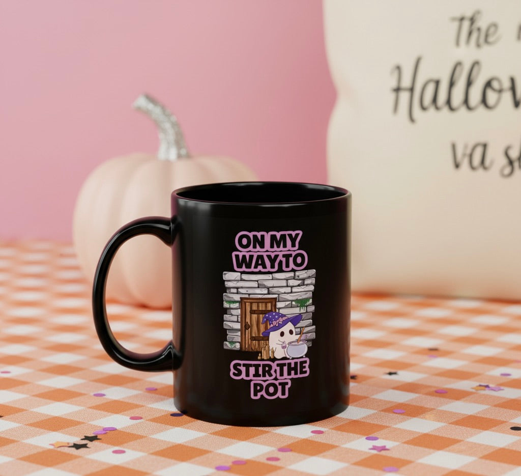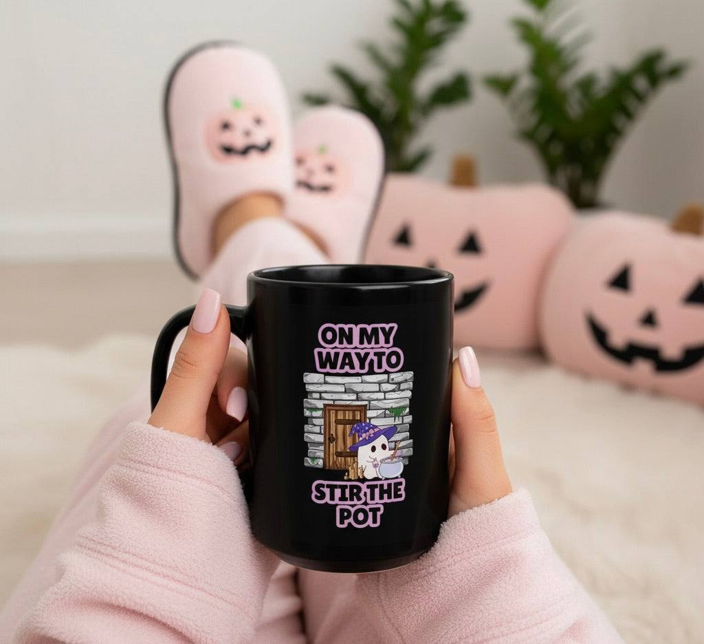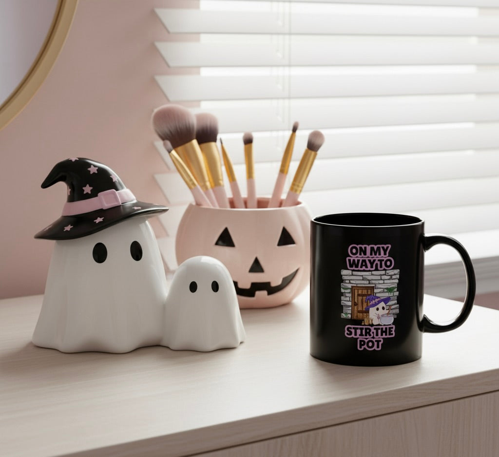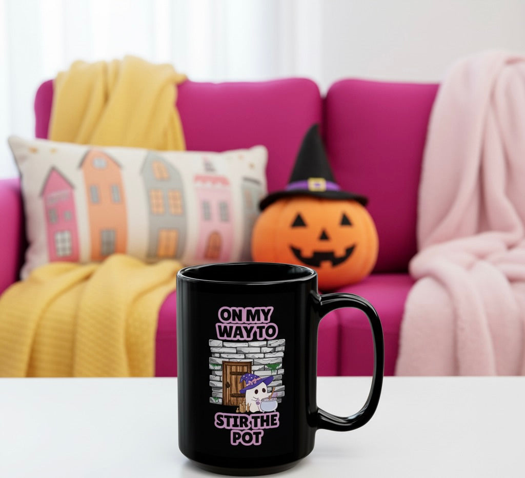 Some people drink coffee to wake up. Others drink it to stir up trouble. The "On My Way to Stir the Pot" mug features a cheeky little ghost in a witch hat, brewing up something sassy in a cauldron. With a playful Halloween vibe and sarcastic edge, this mug is perfect for anyone who thrives on caffeine and chaos. Whether you're mixing potions, spilling tea, or just clocking into another day of nonsense, this mug has you covered. Cute, creepy, and a little bit petty— it's the ultimate spooky season accessory.