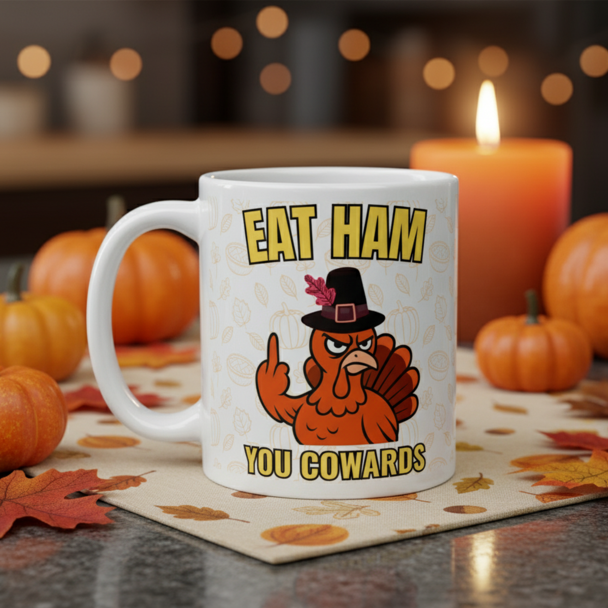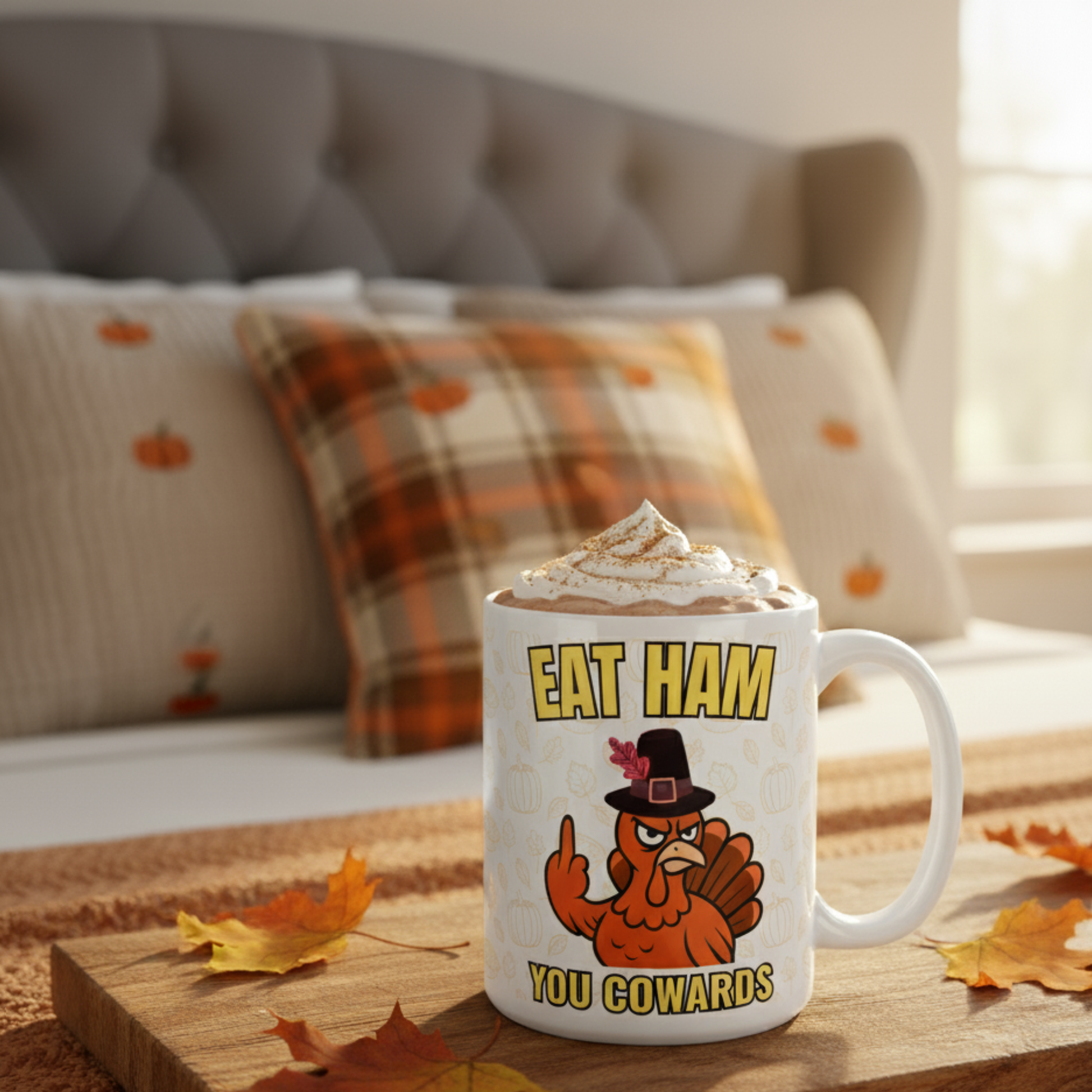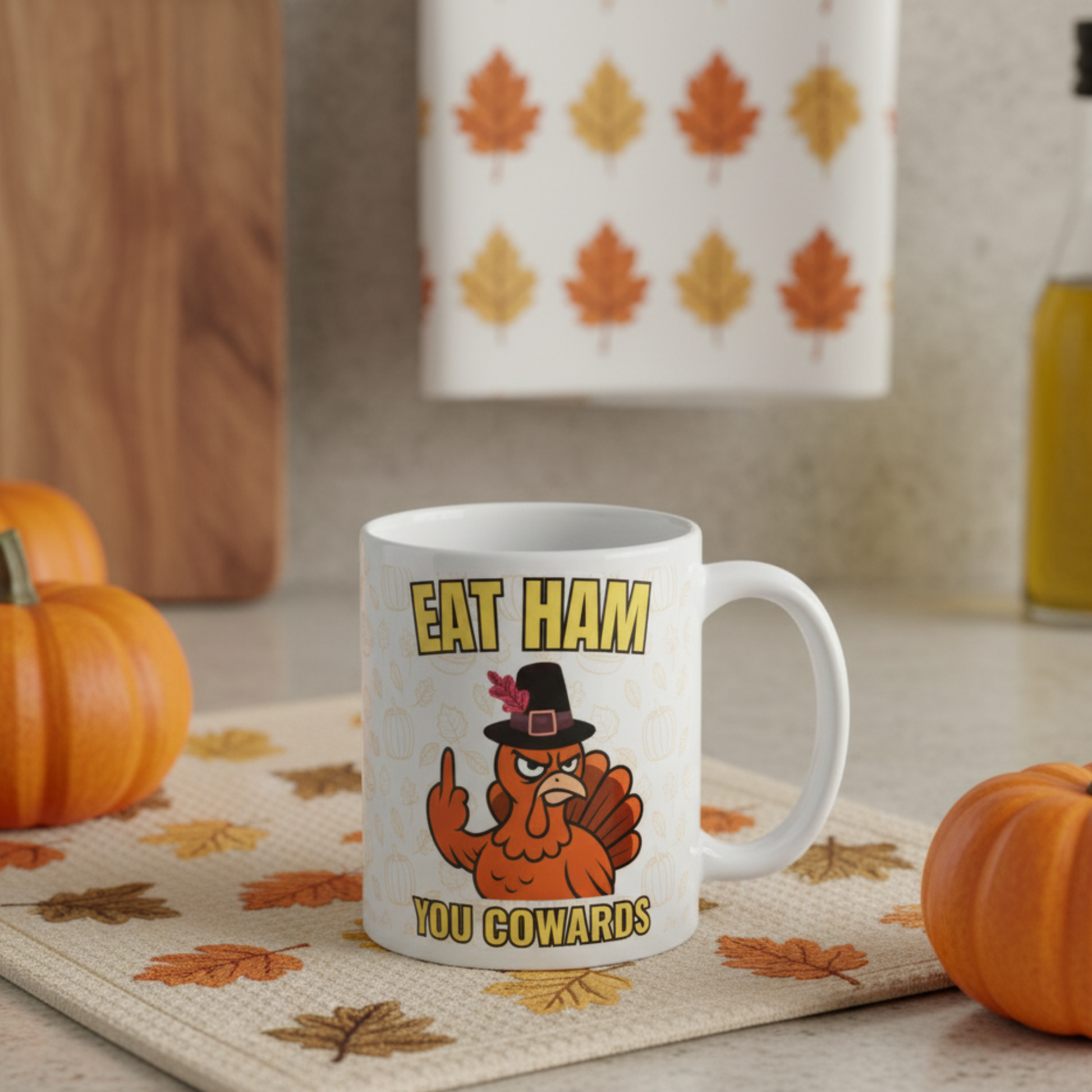The turkey has had enough— and he's not afraid to flip the bird. Our "Eat Ham, You Cowards" mug is the perfect blend of sass, sarcasm, and rebellion against the Thanksgiving tradition. Whether you're sipping coffee, tea, or something stronger to get through family dinner, this mug delivers the attitude loud and clear. Ideal for anyone who sides with the turkey, hates small talk, or just loves dark humor with their caffeine. This year, skip the turkey tears— go full ham.