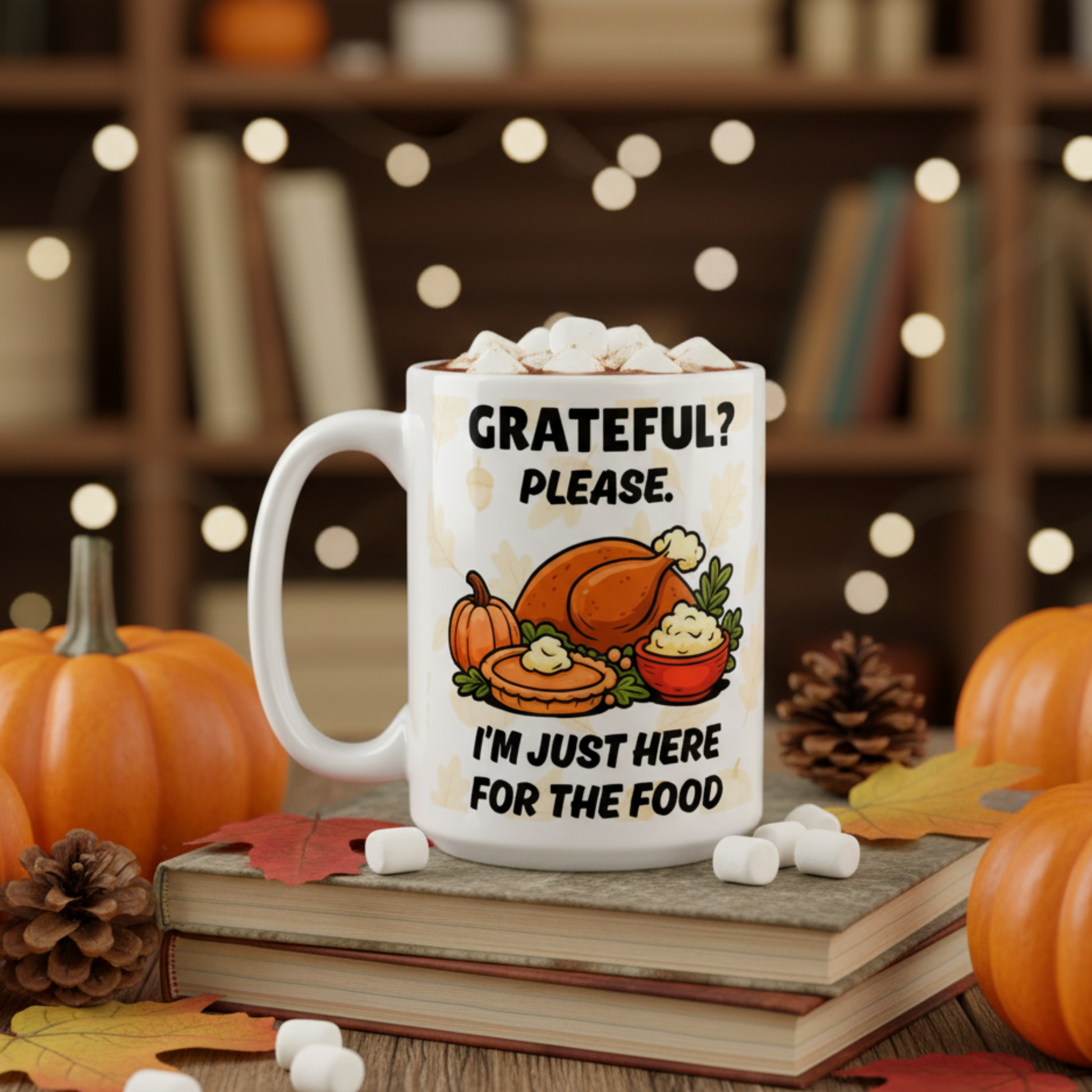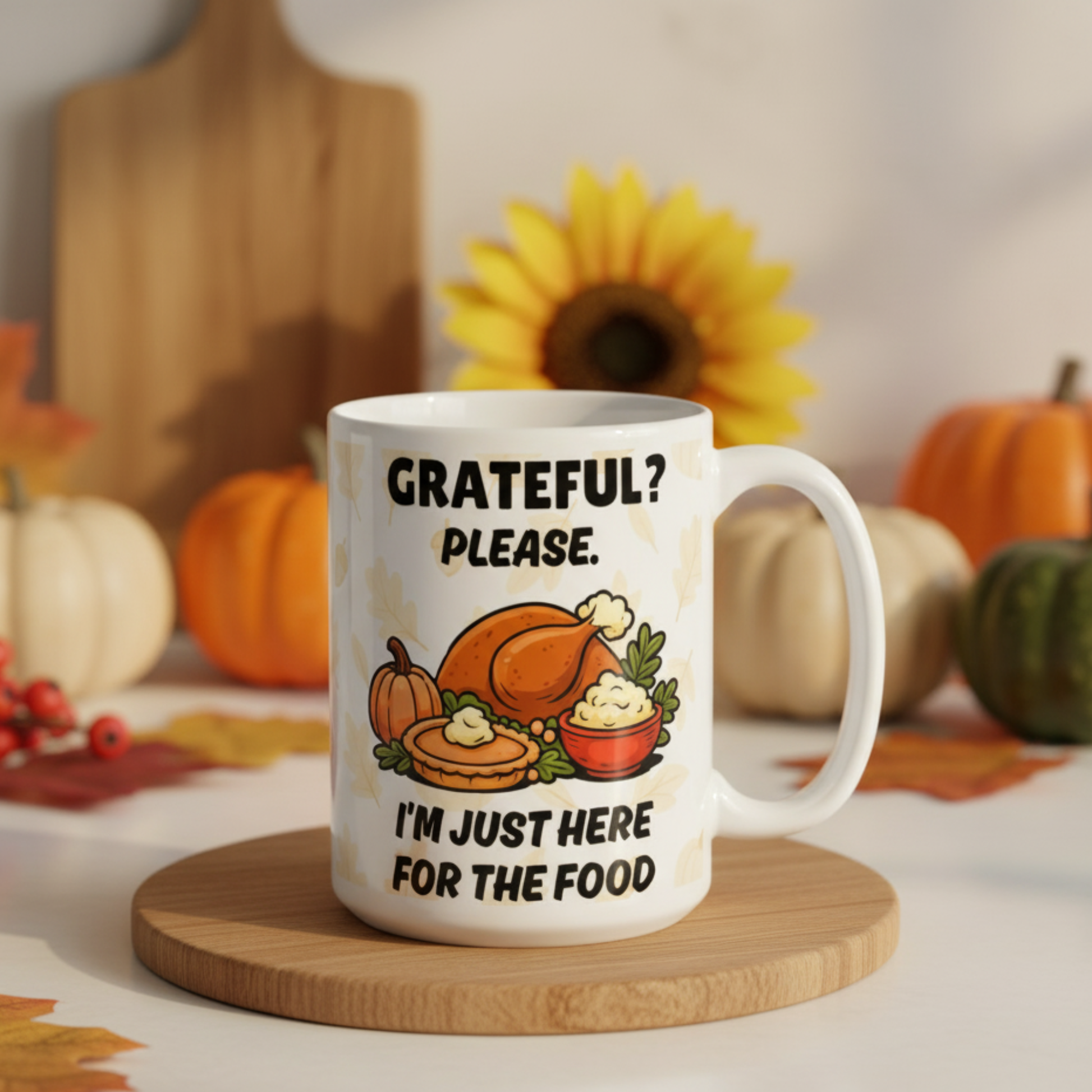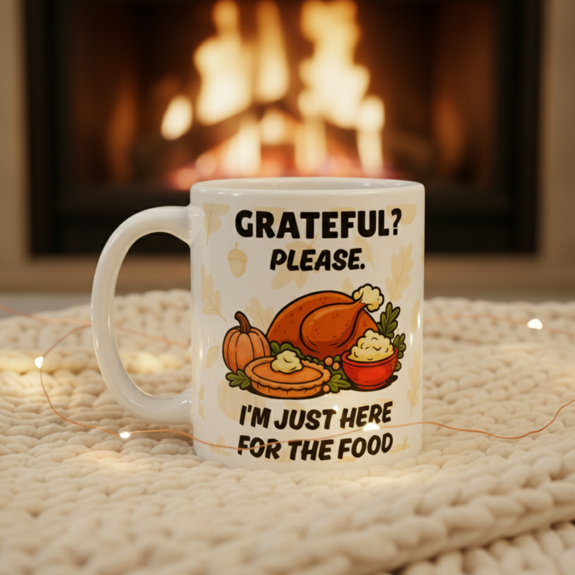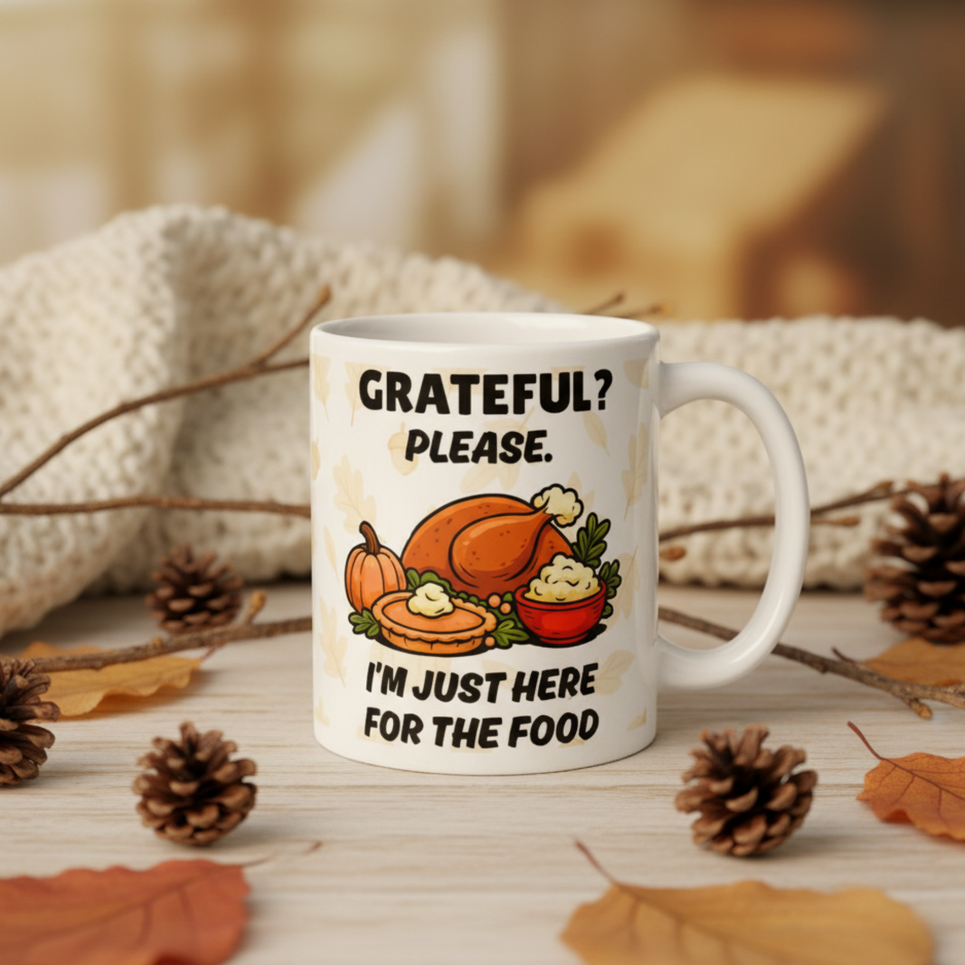 Gratitude is overrated— pass the pie. Our "Grateful? Please. I'm Just Here For the Food" mug is the ultimate holiday mood for anyone who's not into forced thankfulness but is very into mashed potatoes, stuffing, and second (or third) helpings. Perfect for Thanksgiving, Friendsgiving, or any day you're in it just for the snacks, this mug makes your priorities clear without saying a word. Fill it with coffee, tea, or wine (we won't judge). Who needs gratitude when there's gravy?