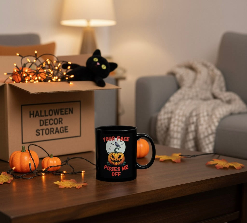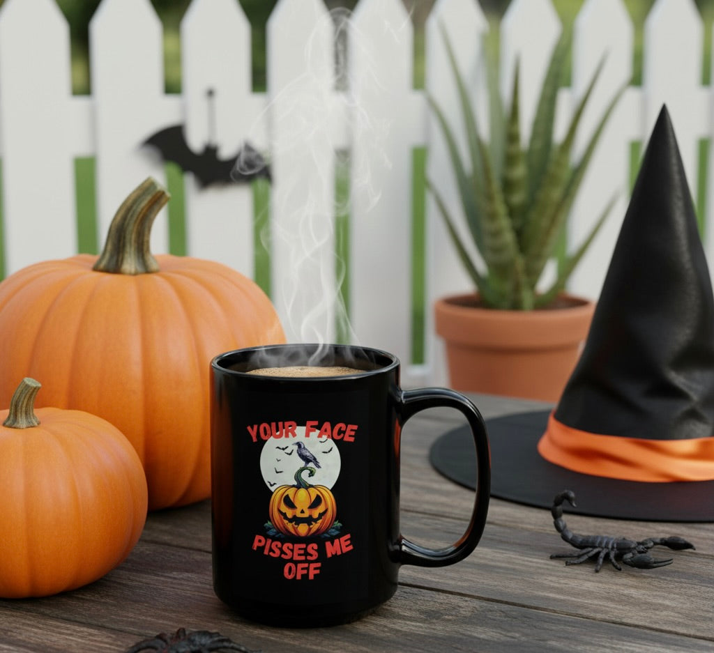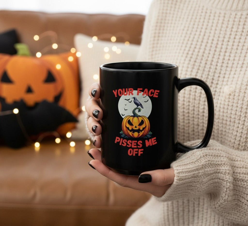 When coffee isn't enought to deal with people...let your mug do the talking. This bold Halloween-inspired mug features a wickedly grinning jack-o'-lantern, a spooky full moon, bats, and a raven perched on top—complete with the unapologetically blunt phrase: "Your Face Pisses Me Off". Perfect for those mornings when caffeine is the only thing keeping you civil, Halloween lovers who like their decor served with sarcasm, and gifting to your sassiest, most unfiltered friends. Whether it's spooky season or just another Monday, this mug makes sure everyone knows exactly where you stand—before you've even had your first sip.